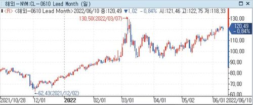 10일(현지시간) 뉴욕상업거래소에서 7월물 서부텍사스산원유(WTI) 가격은 전장보다 84센트(0.69%) 하락한 배럴당 120.67달러에 거래를 마쳤다.