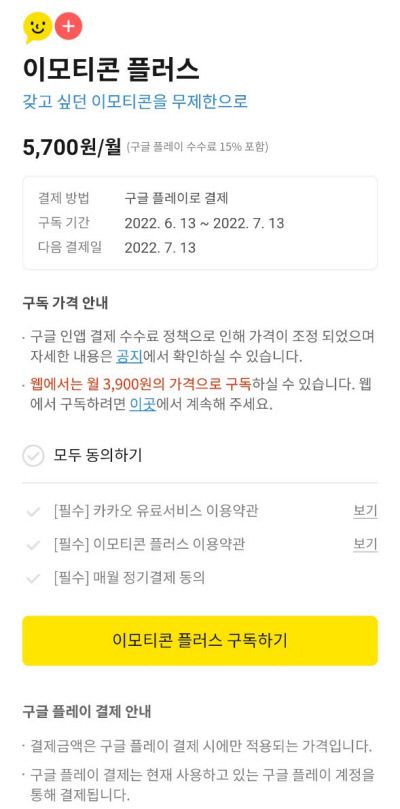 13일 기준 카카오는 카카오톡에서 무제한으로 이모티콘을 사용할 수 있는 ‘이모티콘 플러스’ 구독 페이지에 ‘웹에서는 월 3900원의 가격으로 구독할 수 있다’는 안내 문구를 걸어놓았다. 웹 결제로 통하는 아웃링크도 추가했다. 구글 인앱정책 적용 요구에 따라 가격을 기존 월 4900원에서 월 5700원으로 올리면서 ‘구글 플레이 수수료 15%포함’이라는 문구도 달았다.