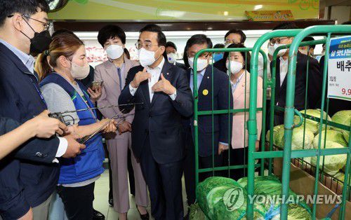 (서울=연합뉴스) 임형섭 기자 = 더불어민주당 박홍근 원내대표를 비롯한 민생우선실천단 소속 의원들은 15일 서울 영등포 농협하나로마트를 찾아 상인들과 주민들을 만났다.