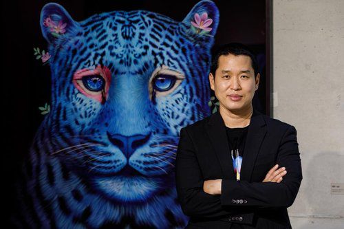 이번 전시는 고상우가 홍보대사로 활동하는 세계자연기금(WWF) 한국본부가 사비나미술관과 공동 주최했다. 사진은 고상우 작가와 작품 '레오'. 2022.6.15 [사비나미술관 제공. 재판매 및 DB 금지]