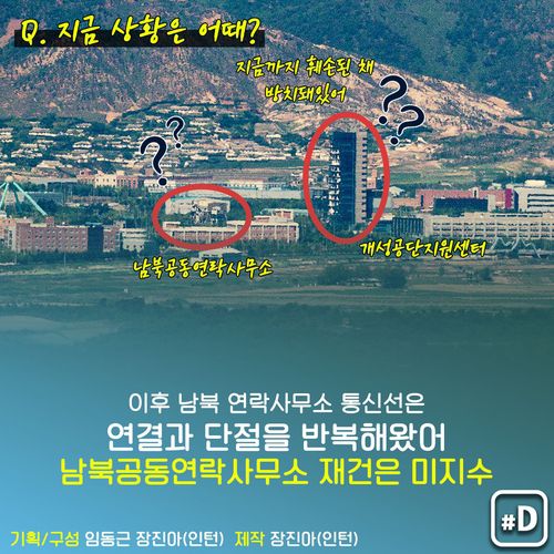 남북 간 화해 무드가 무르익던 2018년 남북 정상은 4월 27일 '판문점 선언'에 합의하고 핵심 사항으로 남북공동연락사무소를 설치하기로 했죠. 그해 9월 14일엔 개성공단 내에 연락사무소가 문을 열었어요.