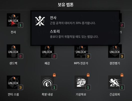 개인 무장뿐만 아니라 팀 전체에 적용되는 업그레이드 레벨에 공통으로 투자하는 시스템도 구현됐다. 기본 화기, 특수 장비, 전술강화 등의 레벨에 따라 사용 가능한 장비가 늘어나거나 추가적인 효과를 얻을 수 있는 방식이다.
