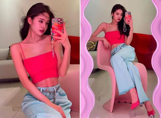 공개된 사진 속 프리지아는 몸매가 드러나는 빨간색 초밀착 크롭트 티에 청바지를 입고 다양한 포즈를 선보였다.