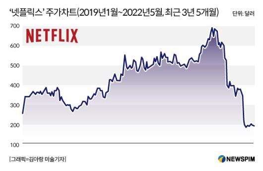 하지만 기세 등등했던 주가상승 기간은 길지 않았다. 과연 넷플릭스는 디즈니플러스, 아마존프라임, HBO 맥스, 애플TV 등의 막강한 경쟁사들이 존재하는 상황에서 한국 콘텐츠로 계속해서 저비용 고품질을 유지하며 성장할 수 있을까? 투자자들의 의문이 숫자로 확인되기까지는 오랜 시간이 걸리지 않았다. 넷플릭스는 2022년 1분기에 20만명의 구독자수 감소를 발표했고 실적 발표 당일에 주가는 35% 폭락했다.