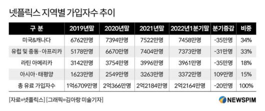 넷플릭스의 1분기 유료 가입자수 20만명 감소 발표 후 시장이 경악했던 이유는 미국&캐나다 구독자수의 감소 때문이었다. 가장 구독료가 높은 미국&캐나다 지역에서 무려 64만명의 구독자 감소가 일어났고 라틴아메리카에서도 35만명이 감소했다. 이런 현상은 경쟁 OTT인 디즈니플러스와 훌루 등의 영향으로 쉽게 반전이 일어나기 어렵다는 게 업계 관계자들의 전망이다.