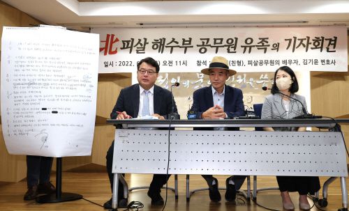 ‘서해 공무원 피살 사건’ 피해자 유가족들과 법률대리인 김기윤 변호사(왼쪽)가 17일 서울 서초구 서울지방변호사회 변호사회관에서 기자회견을 하고 있다./연합 |