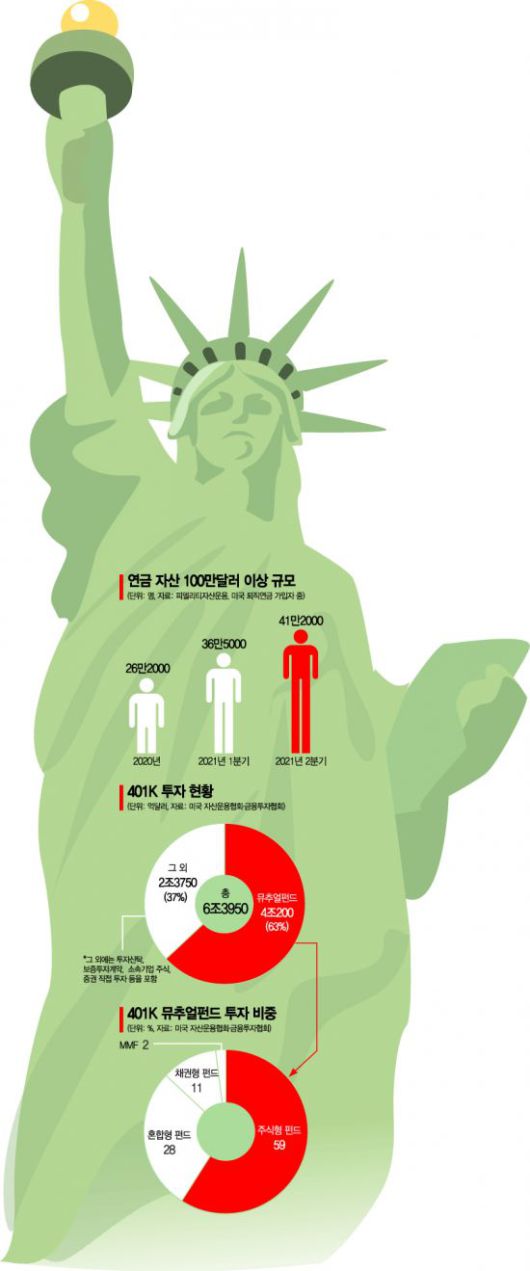 ◇미국 연금부자 만든 ‘401K’…디폴트옵션이 1등공신= 16일(현지시간) 피델리티자산운용에 따르면 지난해 2분기 기준 401K 퇴직연금 계좌에 금융자산 100만달러 이상을 보유한 근로자는 41만2000여명에 달한다. 401K란 미국의 퇴직연금 제도를 말한다. 한국의 확정기여형(DC) 퇴직연금이라고 생각하면 된다.