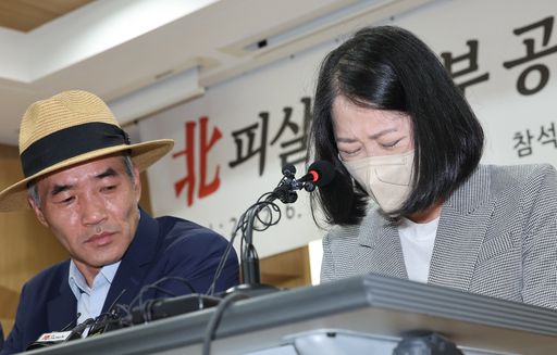 유족 “월북 프레임 만들려 수사 조작” 눈물 2020년 9월 서해에서 북한군에 피살된 공무원 이모씨의 배우자가 17일 서울 서초구 서울지방변호사회에서 기자회견을 열고 아들이 윤석열 대통령에게 쓴 편지를 대독하던 중 눈물을 흘리고 있다. 왼쪽은 이씨의 형 이래진씨. 유족들은 당시 수사에 대해 “전 정권의 국정농단”이라며 “누군가의 지시에 의해 월북 프레임을 만들려고 조작된 수사를 한 것”이라고 주장했다. 연합뉴스 |