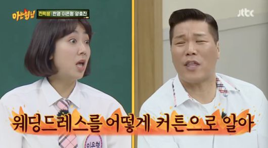 한편 이은형은 "이번에 이사를 했는데 이삿짐 센터 직원 분께서 '옷방에 있는 흰 커튼은 어디에 둘까요?'라고 묻길래 봤더니 내 웨딩드레스더라"고 전했다. 그도 그럴 게 이은형은 맞는 드레스가 없어 돈을 들여 직접 제작했다고. 한영과 양효진은 공감하며 "수입드레스가 싫어도 어쩔 수 없다. 드레스 피팅하고 수선 안 한 채로 입었다"고 덧붙였다.