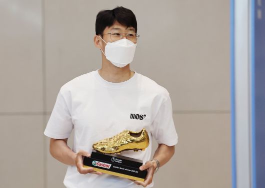2021~22 잉글랜드 프리미어리그 득점왕에 등극한 손흥민이 지난달 24일 골든 부트를 들고 입국길에 ‘NOS7’이 새겨진 흰색 티셔츠를 입고 등장해 화제가 됐다. [연합뉴스] |