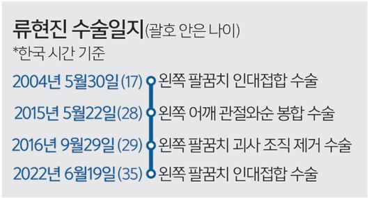 류현진은 재활 기간이 짧은 ‘팔꿈치 인대 일부’를 제거하는 수술과 왼쪽 팔꿈치 인대를 완전히 제거한 뒤 다른 부위 힘줄로 인대를 재건하는 ‘팔꿈치 인대접합 수술’을 두고 고민하다 결국 후자를 선택한 것이다. 재활 기간이 길더라도 더 완벽한 몸 상태로 돌아오겠다는 의지로 보인다. 이번이 선수 인생에서 네 번째 수술인 류현진은 동산고 2학년이던 2004년 이미 한 차례 팔꿈치 인대접합 수술을 받은 바 있다. 당시 1년간의 재활 기간을 거쳐 복귀한 뒤 2006년 프로야구 한화에 입단해 데뷔 첫해 신인상과 최우수선수상(MVP)을 동시에 받으며 리그를 평정했다.