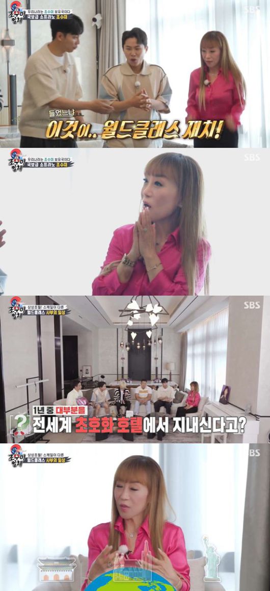 조수미는 스위트룸 생활에 대해 "아티스트는 떠돌이지 않나. 서울에 있다가 내일은 비엔나로 갔다가 그다음엔 뉴욕에 가는 이런 생활을 하니까 아무래도 호텔에서 많이 지낸다. 어떻게 보면 여기가 제 집이고, 내일은 또 오스트리아로 가는데 거기에는 또 다른 호텔 집이 저를 기다리고 있을 거다"라고 말했다.