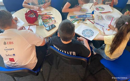 폴란드 크라쿠프 외곽의 난민들을 위한 리셉션 센터에서 아동이 아동심리학자와 함께 심리 교육 등을 받고 있다. [세이브더칠드런 제공] |