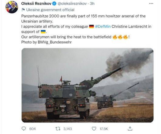 현지 우크린폼에 따르면 올렉시 레즈니코우 우크라이나 국방부 장관은 이날 소셜미디어(SNS) 페이스북, 트위터를 통해 "(독일산) 판처하우비처(PzH) 2000 자주포가 마침내 우크라이나 155㎜ 포탄 무기고의 일부가 됐다"며 독일이 지원한 중화기가 자국에 도착한 사실을 밝혔다.
