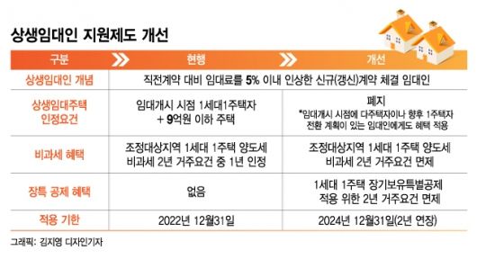 정부는 그간 1주택 임대인에게만 한정했던 '상생임대인 혜택'을 다주택 임대인에게까지 확대 적용한다. 이에 따라 전셋값을 직전 계약 대비 5% 이내로 올린 임대인은 1세대 1주택 양도세 비과세 요건인 '2년 실거주'를 면제받는다. 임대 시점에 다주택자더라도 추후 1주택자인 상태로 상생임대주택을 매도하면 양도세 비과세 혜택을 받을 수 있다. 오는 7월 소득세법 시행령을 개정해 작년 12월 20일 이후 임대분부터 적용하며 오는 2024년 말까지 한시 운영된다.내년 8월까지 1년간 갱신계약이 만료되는 임차인을 대상으로 버팀목 전세대출 지원도 강화한다. 수도권의 경우, 보증금과 대출한도를 현행 3억원·1억2000만원에서 4억원·1억8000만원으로 확대된다. 월세 세액공제 한도도 총 급여 7000만원 이하 10%, 5500만원 이하 12%에서 각각 12%, 15%로 상향 조정된다. 임차보증금 원리금 상환액 소득공제 한도 역시 연 300만원에서 400만원으로 늘어난다.