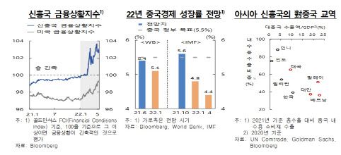 또한 신흥국 중 가장 큰 비중을 차지하는 중국의 경제성장률 둔화 여파도 큰 악재로 떠올랐다. 올 4월말 신흥국의 미 달러화 표시 회사채 잔액 2조6000억달러 중 중국의 비중은 36.7% 수준인데, 이런 중국이 경기 둔화 위기에 직면한 것이다. 중국 내 부동산 시장의 부진 지속, 제로 코로나 정책 고수 등에 따라 중국의 성장률 전망은 점차 낮아지는 모습이다. 국제통화기금(IMF)는 올해 중국의 성장률 전망을 1월 4.8%에서 석달 만인 4월 4.4%로 하향 조정했다. 중국의 경기둔화는 중국과 교역이 활발한 아시아 신흥국의 실물부문에 부정적 영향을 초래할 것으로 예상된다.