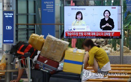 원숭이두창 의심 환자 관련 질본 브리핑(영종도=연합뉴스) 김도훈 기자 = 원숭이두창 국내 의심 환자 1명이 방역 당국의 유전자증폭(PCR) 검사에서 양성 판정을 받은 것으로 알려진 22일 오후 인천국제공항 제1여객터미널 입국장에 설치된 TV에 질병관리청의 브리핑이 생중계되고 있다. 2022.6.22 superdoo82@yna.co.kr ▶제보는 카카오톡 okjebo▶연합뉴스 앱 지금 바로 다운받기~▶네이버 연합뉴스 채널 구독하기<저작권자(c) 연합뉴스, 무단 전재-재배포 금지>