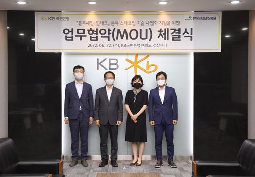 (서울=연합뉴스) 임성호 기자 = 한국인터넷진흥원(KISA)은 KB국민은행과 '블록체인·핀테크 스타트업 기술 사업화 지원' 업무협약을 22일 체결했다고 밝혔다.