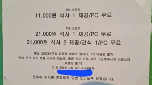 게시된 사진 속에는 연천 지역 한 PC방 요금제 안내문 문구가 적혀 있었습니다. 안내문에 따르면 해당 PC방은 평일 1만 1,000원으로 식사 1끼와 컴퓨터를 무료로 사용할 수 있고, 주말에는 2만 1,000원으로 식사 1끼와 컴퓨터 사용, 3만 1,000원으로 식사 2끼와 컴퓨터를 사용할 수 있습니다.