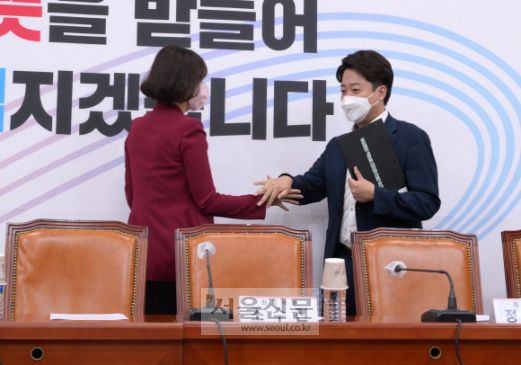 배현진 악수 뿌리친 이준석… “어디다 지적질이냐” 발끈 - 이준석(오른쪽) 국민의힘 대표가 23일 국회에서 열린 당 최고위원회의에 참석하며 최근 신경전이 잦았던 배현진 최고위원이 악수하려고 내민 손을 밀어내고 있다. 배 최고위원이 어깨를 건드려도 미동하지 않던 이 대표는 지역구 조직위원장 공모 결과를 보고받다가 “좋은 얘기를 하면 대표가 들으라”는 배 최고위원의 말을 듣고는 “어디다 지적질이냐”고 반발하기도 했다.김명국 기자 |