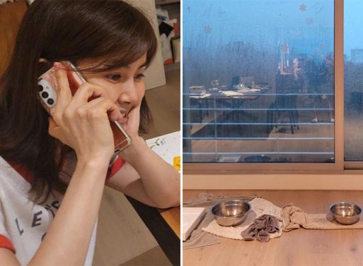 배우 차인표가 공개한 그의 아내 배우 신애라의 모습과 집에 빗물이 새 임시조치를 한 모습./사진=신애라 인스타그램