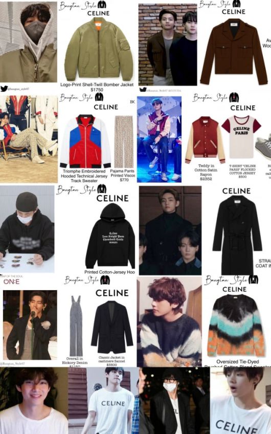 뷔는 사복뿐만 아니라 무대, 각종 화보, 뮤직비디오에서도 셀린느 의상을 즐겨 입고 있으며, 뷔가 착용한 의상은 품절사태를 불어오고 있다.