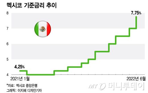 멕시코가 기준금리를 한 번에 0.75%포인트 올린 것은 이번이 처음이다. 블룸버그는 멕시코의 이번 금리인상에 대해 "방시코가 2008년 인플레이션 목표 시스템을 도입한 이후 가장 큰 폭의 인상이자 미국 연방준비제도(Fed·연준)의 자이언트스텝에 따른 후속 조치"라며 "방시코는 갑작스러운 자금 유출을 막고자 미국의 통화정책 대응을 뒤따르는 경향이 있다"고 진단했다.