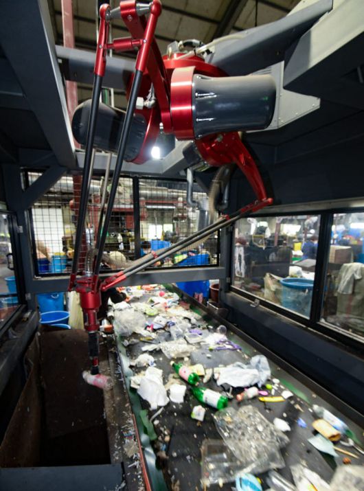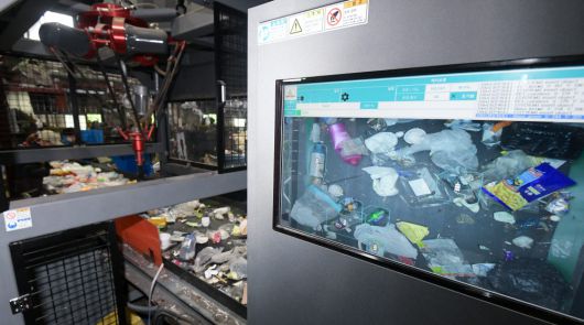 수작업에만 의존해 온 재활용폐기물 분류에 인공지능(AI) 로봇이 투입돼 일손을 돕는다. 인천 남동구 현대자원에 설치된 에이트테크의 재활용 쓰레기 분류 로봇 '에이트론'이 페트병만 분류하고 있다. 에이트론은 분당 최대 96개를 분류할 수 있다.