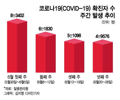 주간 확진자 수 감소 추이는 큰 폭으로 줄었다. 이달 첫째 주(5월30일~6월5일) 주간 확진자 수는 8만3402명, 둘째 주(6~12일)는 6만1830명으로 일주일 새 2만1572명이나 줄었다. 이어 셋째 주 주간 확진자 수가 5만1098명을 기록해 직전 주 대비 1만732명의 감소 폭을 보였다. 하지만 이달 20일부터 26일까지 주간 확진자 수는 4만9576명으로 직전 주보다 1522명 감소하는 데 그쳤다.