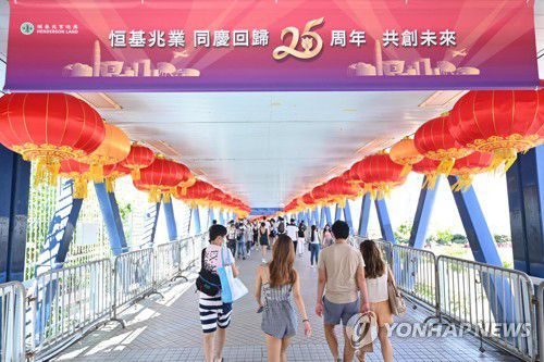 (AFP=연합뉴스) 홍콩의 한 육교에 주권 반환 25주년 기념 현수막이 걸린 모습. 2022.6.27. |