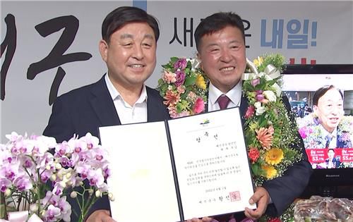 당선증을 받고 기념사진 찍는 황선봉 예산군수와 최재구 당선인(오른쪽) |