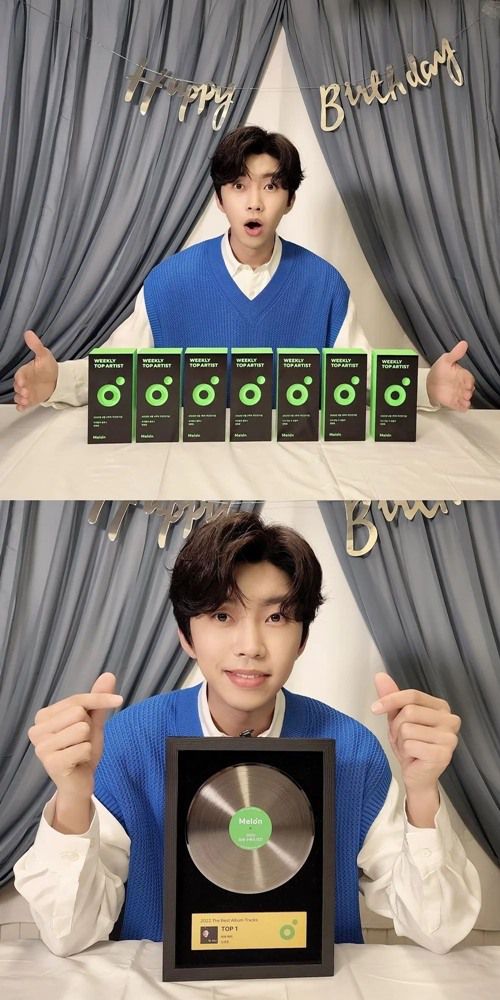이번에 함께 공개된 사진에는 멜론 주간인기상 7개를 앞에 놓고 포즈를 취하고 있는 임영웅의 모습이 담겨 있다.