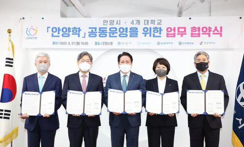 (안양=연합뉴스) 김인유 기자 = 경기 안양시는 27일 대림대·성결대·안양대·연성대와 '안양학 공동 운영을 위한 업무협약'을 체결했다.