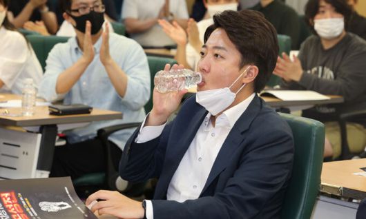 국민의힘 이준석 대표가 27일 국회에서 열린 ‘반지성 시대의 공성전’ 세미나에 참석해 물을 마시고 있다. 서상배 선임기자 |