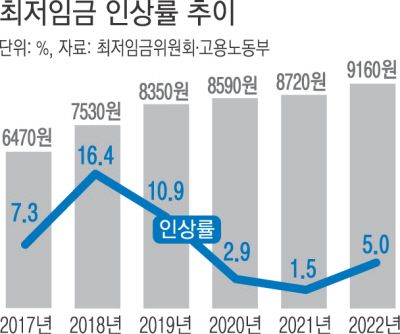 ‘임금발 인플레이션’에 대한 우려 속에 최저임금 인상은 난항을 겪고 있다. 일반적으로 최저임금 인상률은 물가 상승률보다 높은 수준으로 정하지만 올해는 고물가로 인상론이 힘을 얻지 못하는 분위기다. 정부 등도 임금발 인플레이션을 경고하고 나섰다. 한국은행은 지난 4월 ‘최근 노동시장 내 임금 상승 압력 평가 및 시사점’ 보고서에서 “물가 상승률이 높은 시기에 노동비용이 더욱 쉽게 물가에 전가된다”며 “물가와 임금 상승의 악순환 가능성도 배제할 수 없다”고 했다. 추경호 부총리 겸 기획재정부 장관도 지난 26일 언론 인터뷰에서 물가와 임금 상승의 악순환을 경고하며 임금 인상을 자제할 것을 당부했다.
