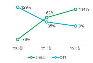 우선 코로나 19 팬데믹 직후인 지난 2020년 5월 문화소비 관련 매출액은 전년 동월 대비 75.9% 감소했으며, 매출건 수 역시 77.9% 줄어들었다. 반면, 집합금지 시행 및 사회적 거리두기 등으로 인해 OTT 업종의 매출액 및 건수는 각각 128.6%, 114.9%씩 증가한 것으로 확인됐다.