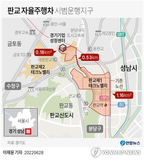 (수원=연합뉴스) 김경태 기자 = 경기도 성남시 판교 자율주행차 시범운행 지구가 기존 노선형에서 구역형으로 확대된다.