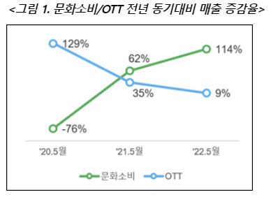 우선 코로나19 발생 다음해인 2020년5월 문화소비 관련 매출액은 전년 동기 대비 75.9% 감소했고 매출건수도 77.9% 줄었다. 반면 집합금지 시행 및 사회적 거리두기 등으로 인해 OTT 업종의 매출액과 건수는 각각 128.6%, 114.9% 증가했다.