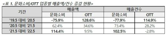 우선 코로나19 발생 직후인 2020년 5월 문화소비 관련 매출액은 전년 동월 대비 75.9% 감소했다. 매출건수 역시 77.9% 줄었다. 반면 집합금지 조치와 같은 사회적 거리두기 시행 등의 영향으로 OTT 업종 매출액과 매출건수는 같은 기간 각각 128.6%, 114.9% 증가했다.