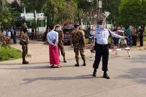 지난해 11월 개학 당시 총 들고 학교 앞을 지키는 미얀마 군인. |