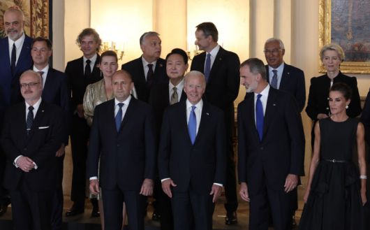 윤석열 대통령이 29일 스페인 마드리드 왕궁에서 열린 펠리페 6세 스페인 국왕 내외 주최 만찬에 참석. 조 바이든 미국 대통령 등 참석자들과 기념촬영을 하고 있다. (사진=연합뉴스) |