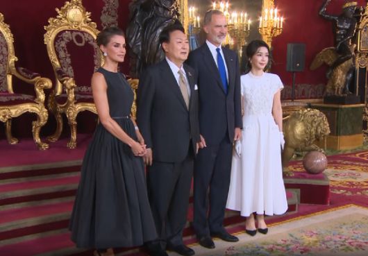 윤석열 대통령과 부인 김건희 여사가 28일(현지시간) 마드리드 왕궁에서 열린 스페인 국왕 내외 주최 갈라 만찬에서 펠리페 6세 국왕과 기념촬영하고 있다. 2022.06.29. [사진=나토 정상회의 사무국 동영상 캡쳐] |