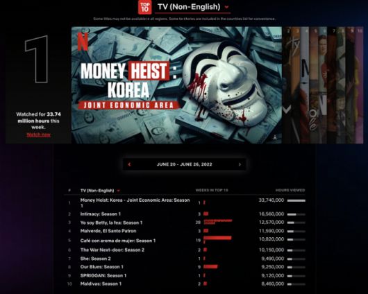 넷플릭스는 오리지널 시리즈 '종이의 집: 공동경제구역'이 공개 3일 만에 넷플릭스 글로벌 톱10 TV(비영어) 부문 1위에 올랐다고 29일 밝혔다.