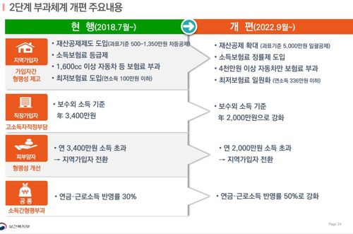 (서울=연합뉴스) 김병규 기자 = 정부가 오는 9월 '건강보험료 부과체계 2단계 개편'을 단행하기로 하면서 여야 합의를 통해 추진하기로 한 건보료 개혁이 마무리를 보게 됐다.