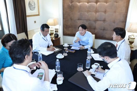 윤석열 대통령이 28일 오전(현지시간) 스페인 마드리드 시내 호텔에서 참모들과 나토(NATO) 정상회담 사전 점검회의를 하고 있다. (대통령실사진기자단) 2022.6.28/뉴스1 © News1 오대일 기자 |