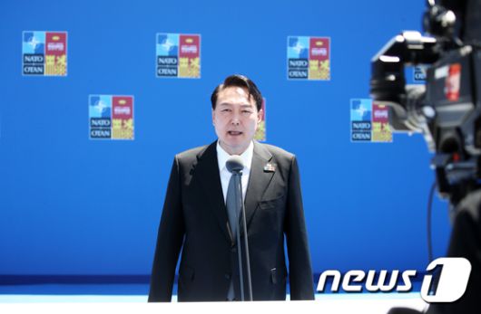 (마드리드=뉴스1) 오대일 기자 = 윤석열 대통령이 29일 오후(현지시간) 나토 동맹국-파트너국 정상회의가 열리는 스페인 마드리드 이페마(IFEMA)에 도착, 취재진 질의에 답하고 있다. (대통령실사진기자단) 2022.6.29/뉴스1