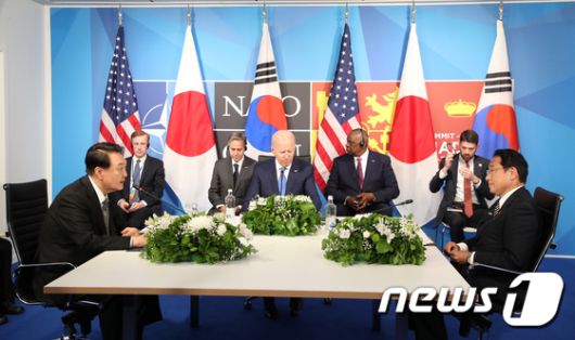 (마드리드=뉴스1) 오대일 기자 = 한미일 3국 정상이 29일 오후(현지 시간) 스페인 마드리드 이페마(IFEMA) 국제회의장에서 정상회담을 하고 있다. 왼쪽부터 윤석열 대통령, 조 바이든 미국 대통령, 기시다 후미오 일본 총리. (대통령실사진기자단) 2022.6.29/뉴스1