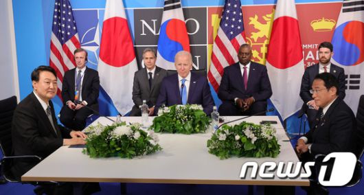 (마드리드=뉴스1) 오대일 기자 = 한미일 3국 정상이 29일 오후(현지 시간) 스페인 마드리드 이페마(IFEMA) 국제회의장에서 정상회담을 하고 있다. 왼쪽부터 윤석열 대통령, 조 바이든 미국 대통령, 기시다 후미오 일본 총리. (대통령실사진기자단) 2022.6.29/뉴스1kkorazi@news1.kr[© 뉴스1코리아(news1.kr), 무단 전재 및 재배포 금지]
