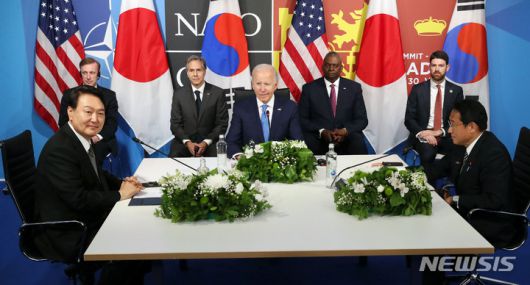 [마드리드=뉴시스] 윤석열 대통령이 29일(현지시간) 마드리드 이페마(IFEMA)에서 조 바이든 미국 대통령, 기시다 후미오 일본 총리와 한미일 정상회담을 하고 있다. 2022.06.29. photo1006@newsis.com |