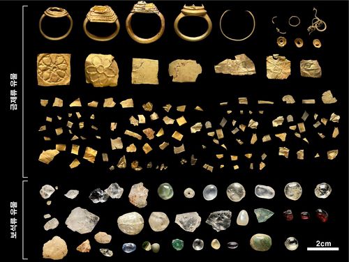 유물은 대부분 중심부 방에서 출토됐다. 금제 유물은 금반지 5점, 금박 판 217점, 금장식 15점으로 구성됐다. 금반지는 둘레가 약 2.5㎝이며, 일부에는 0.2㎜ 두께로 세공한 장식도 있다. 금박 판은 두께가 0.2∼0.3㎜다. 금장식 일부에는 꽃무늬가 새겨졌으며, 목걸이나 귀걸이 부속품으로 짐작되는 유물도 있다.